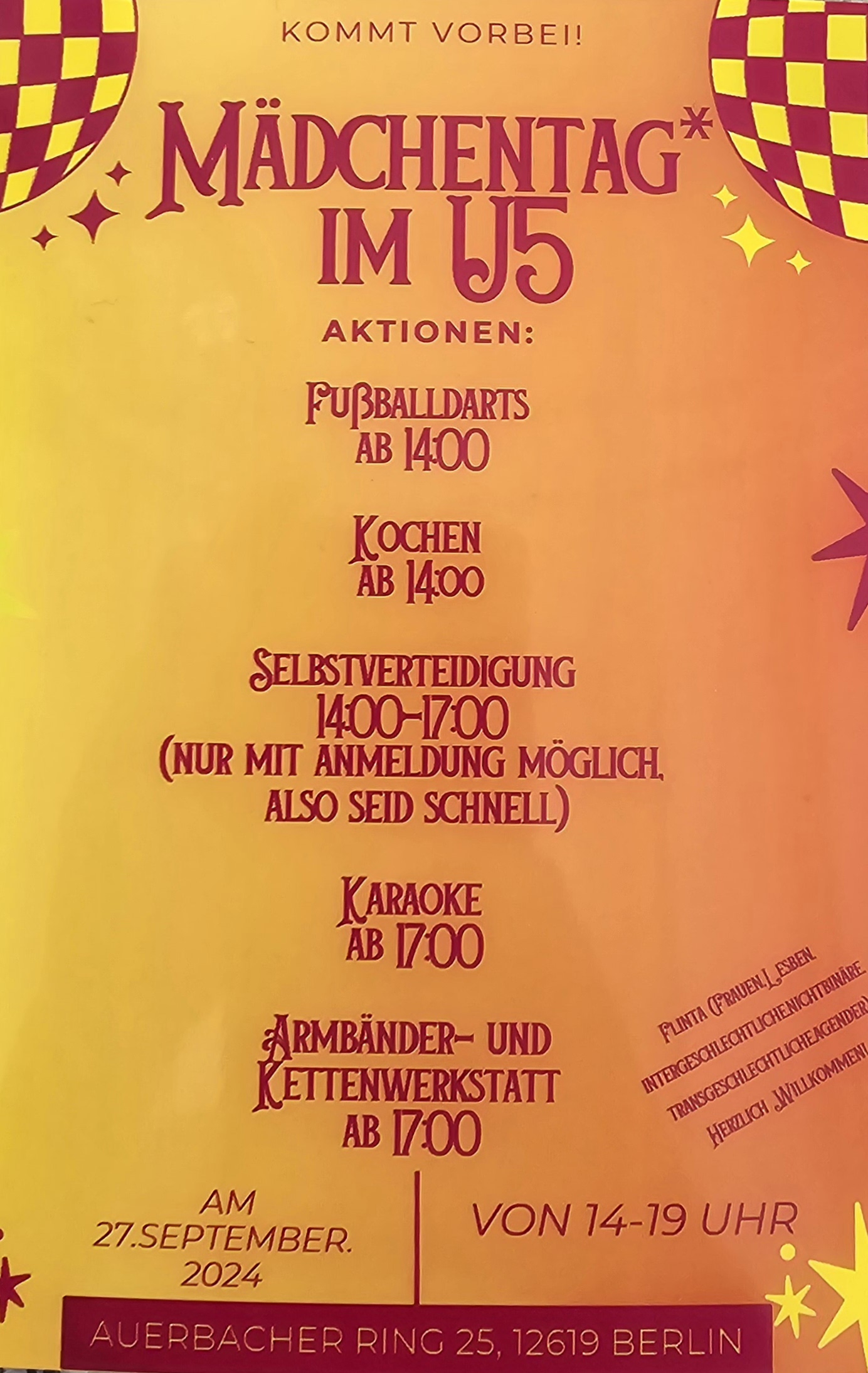 « Alle Veranstaltungen Diese Veranstaltung hat bereits stattgefunden. Mädchentag* 27.09.2024 @ 14:00 - 19:00 Kostenlos « Pen and Paper Gemeinsames Kochen im CDF Schülerklub » Heut bleibt der Club nur für Mädchen* geöffnet! Zum Kalender hinzufügen Google Kalender iCalendar Outlook 365 Outlook Live Details Datum: 27.09.2024 Zeit: 14:00 - 19:00 Eintritt: Kostenlos Veranstalter U5 Telefon: 03089731727 E-Mail: u5@eastend-berlin.com Veranstaltungsort U5 Auerbacher Ring 25 Berlin, Berlin 12619 Germany Google Karte anzeigen